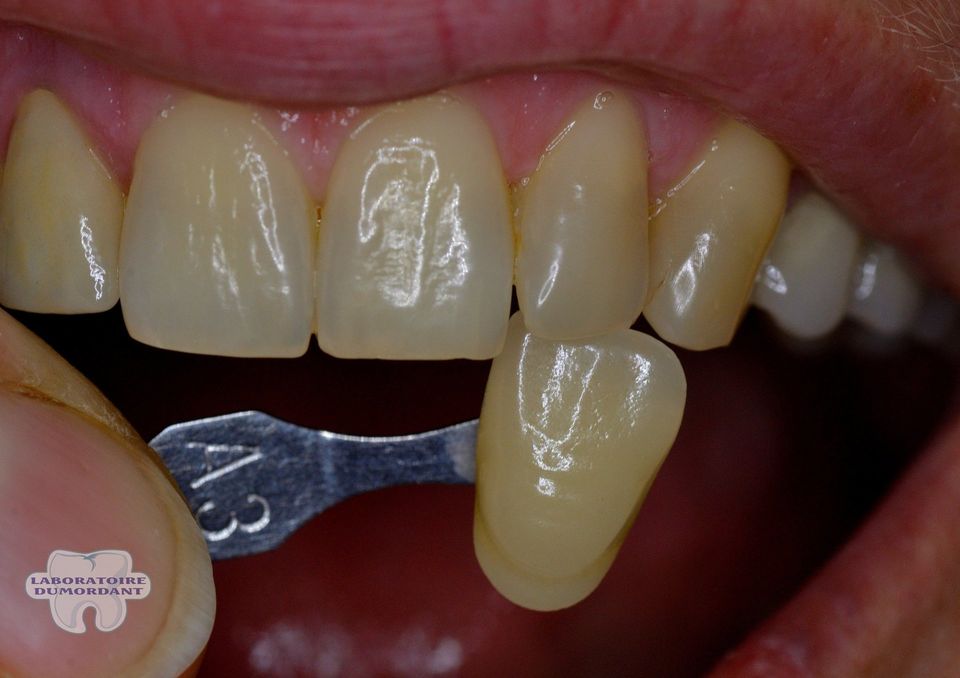 Lors de cette prise de teinte , nous voyons clairement une différence de l'état de surface du teintier et de la dent du patient .